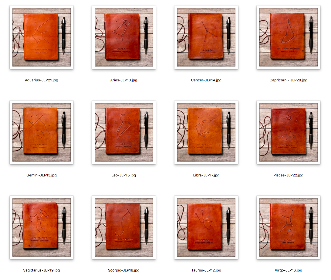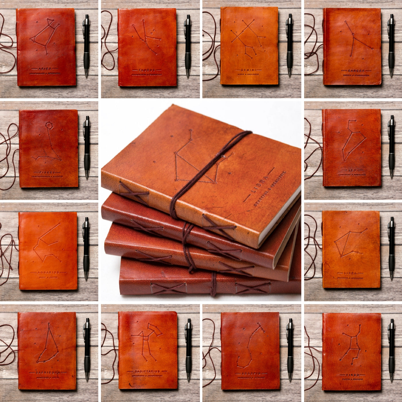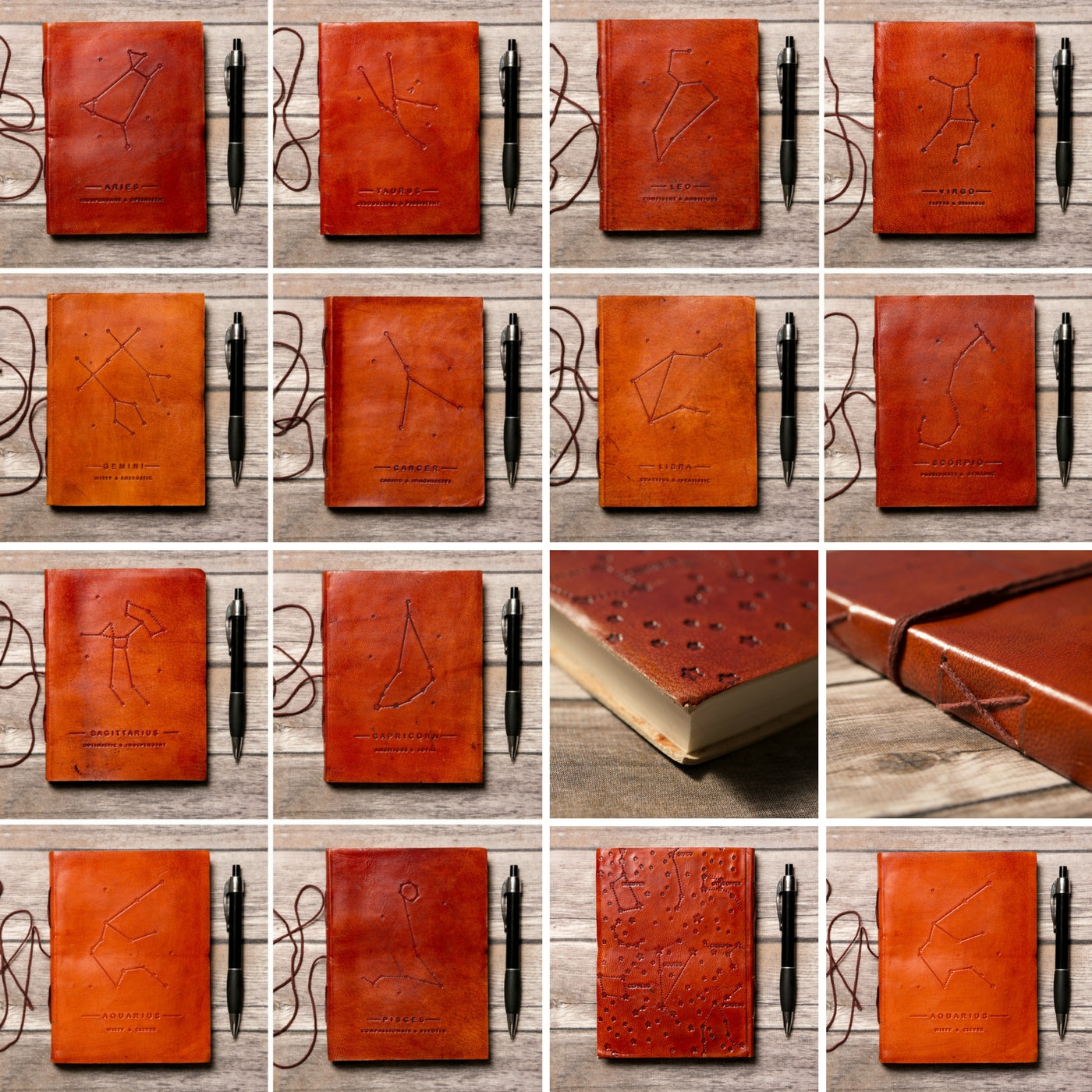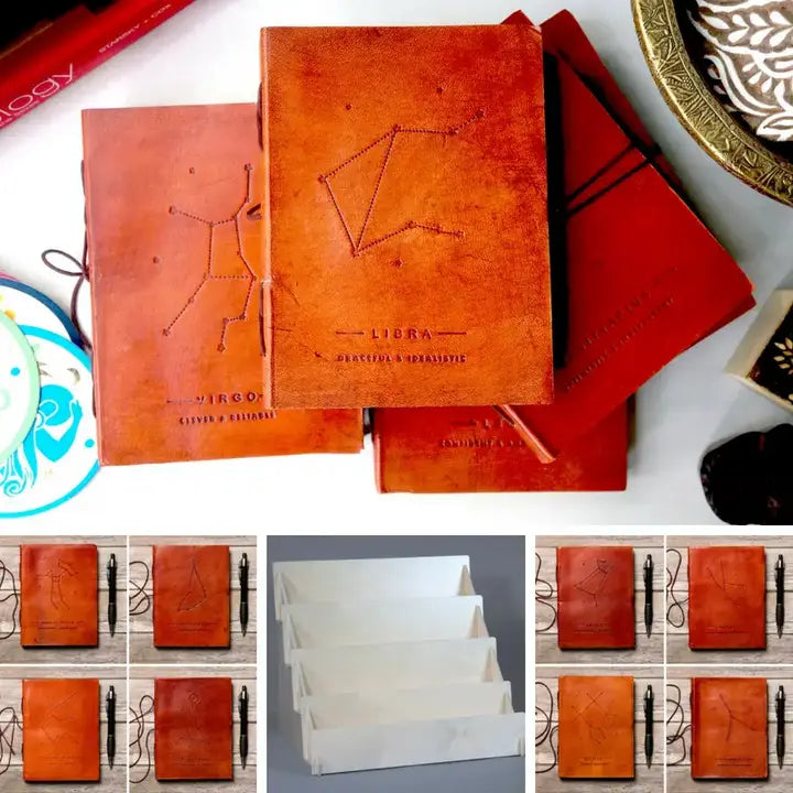 Collection includes all 12 zodiac inspired journals & a display. These are genuine leather journals that are encased in a rich brown leather cover and come with a string tie closure and stitched in paper, giving it an old world feel.