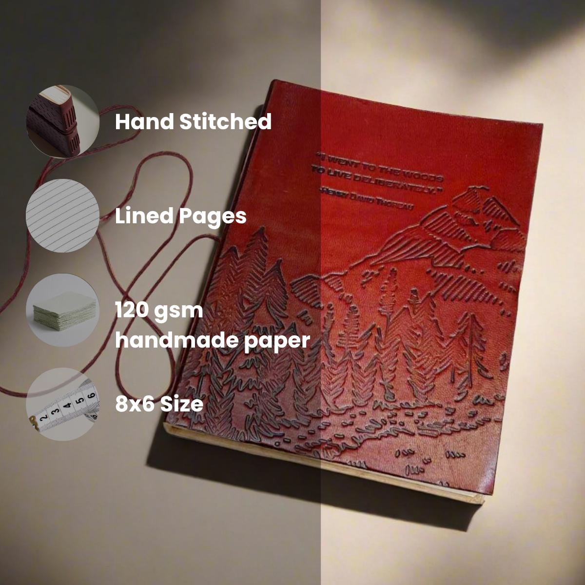Embrace simplicity and intentional living with our inspiring Henry David Thoreau Leather Journal. This handcrafted red leather notebook features the iconic quote: “I went to the woods to live deliberately.” It's the perfect companion for journaling your thoughts, goals, and reflections, guiding you towards a life of purpose and self-discovery.
