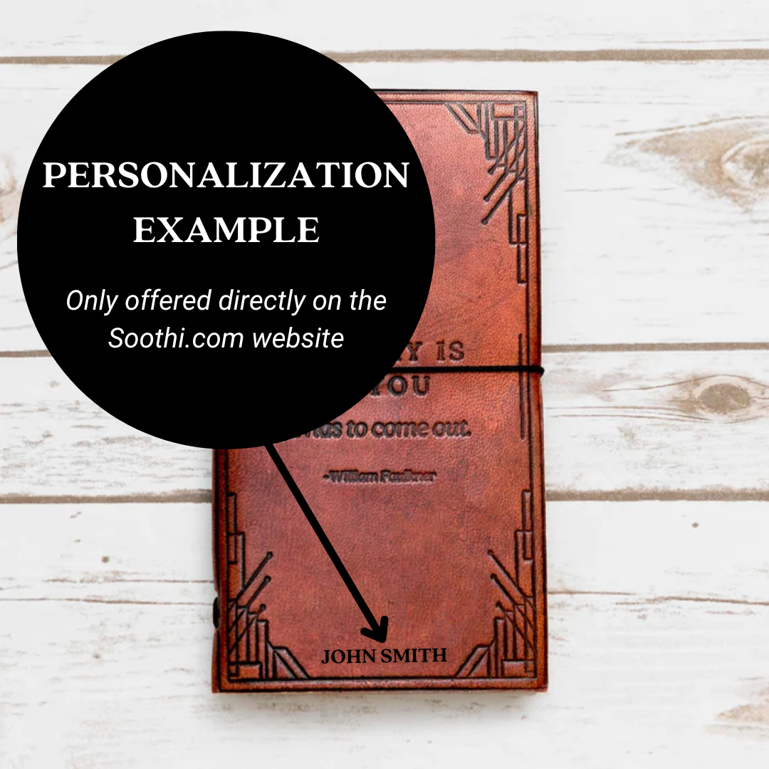 An antique vintage leather journal notebook embossed with the quote “If A STORY IS IN YOU, it has to come out,” by William Faulkner.
