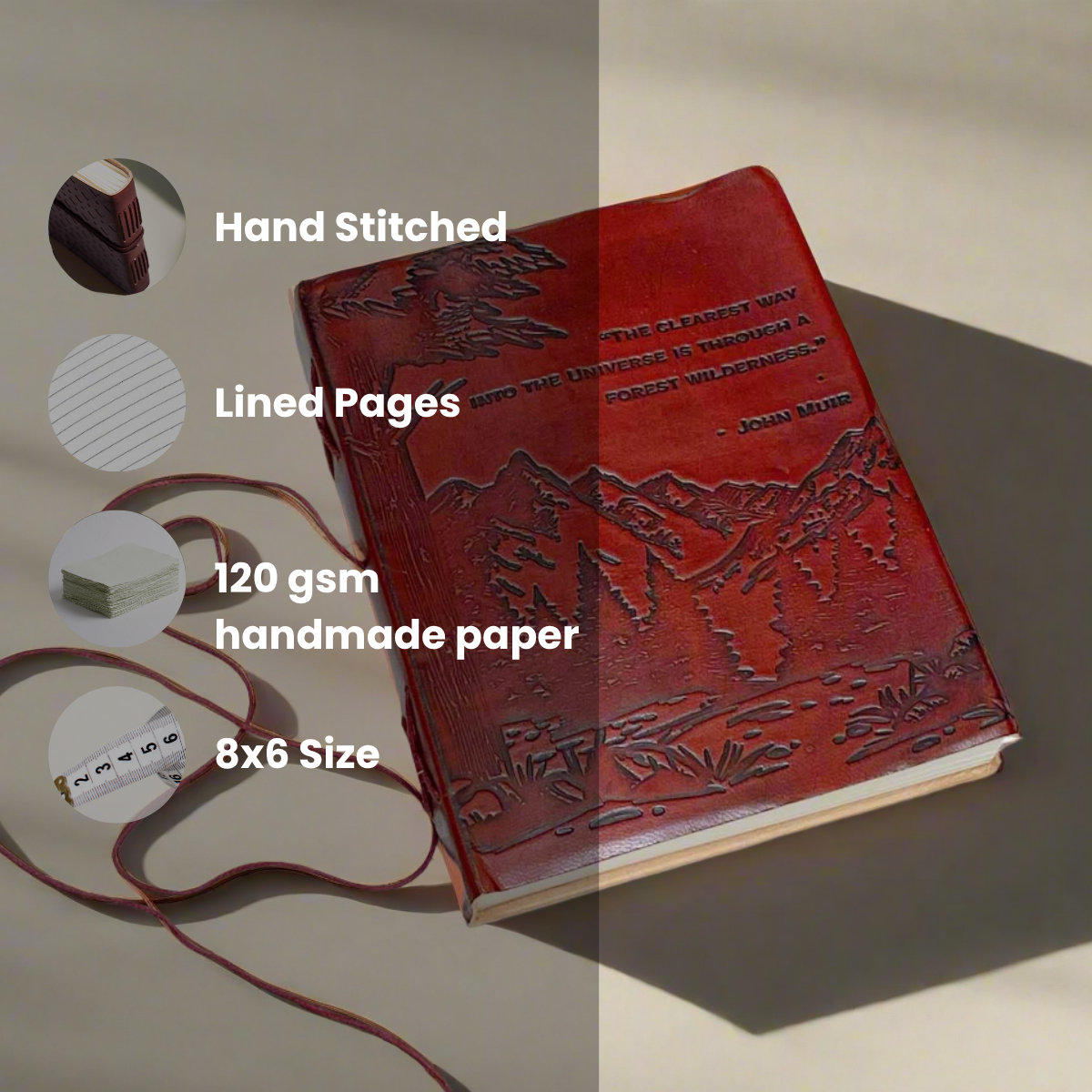 Embark on a journey of profound connection with nature and the universe with our inspiring John Muir Leather Journal. This beautifully handcrafted red leather notebook features the iconic quote: “The clearest way into the universe is through a forest wilderness.” It's the perfect companion for anyone seeking wisdom in the wild, inviting you to explore the natural world and your inner self.