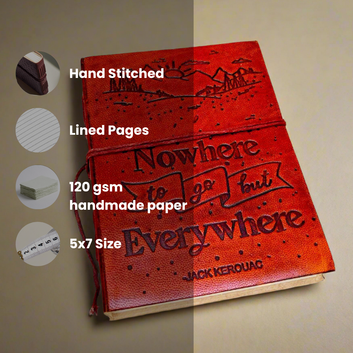 Embrace the spirit of boundless exploration with our inspiring Jack Kerouac Quote Leather Journal, embossed with the iconic words, "Nowhere to go but Everywhere." This journal is your perfect companion for capturing every thought, dream, and adventure, encouraging you to explore both the world outside and the depths of your inner self.