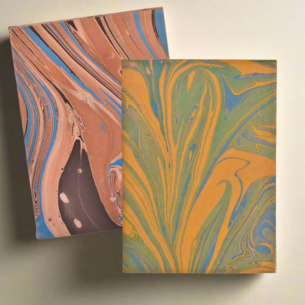 Immerse yourself in artistic expression with our truly unique Marbled Leather Journal, where no two covers are exactly alike. Each journal is a wearable work of art, featuring captivating, organic marbled patterns in a blend of earthy and vibrant tones (like the rich oranges, blues, and greens, or warm browns and deep blues as shown). Handcrafted with love and intention, these journals are designed to inspire every thought and stroke.