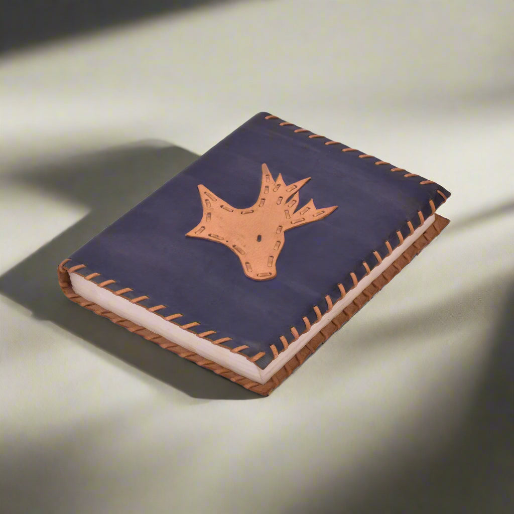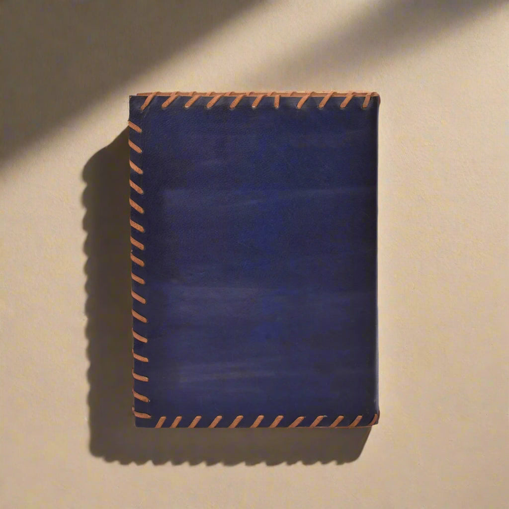 Discover truly unique craftsmanship with our Stitched Patchwork Leather Journal, a testament to artisan skill and sustainable design. Each 5x7 inch notebook features a beautifully rich leather cover, meticulously hand-stitched along the edges and adorned with a distinctive, contrasting leather patch on the front. As seen in the striking blue and light brown example, the stylized patch design (which may vary, given the "Mabled Tone" note implies a range of unique colors) adds a personalized, artistic touch to every journal.
