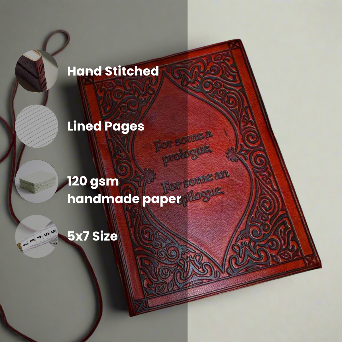 Meticulously made from leather, this journal boasts a rich brown tone with unique variations from natural vegetable dyes, giving each piece its own character. The cover is elegantly embossed with the profound quote, “For some a prologue, for some an epilogue,” framed by an intricate, timeless design. This inspiring message serves as a reminder that every moment holds significance, whether it's a new beginning or a meaningful conclusion.