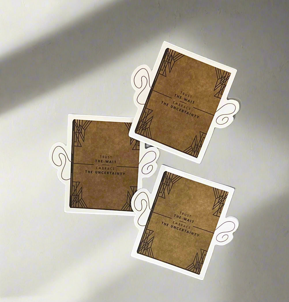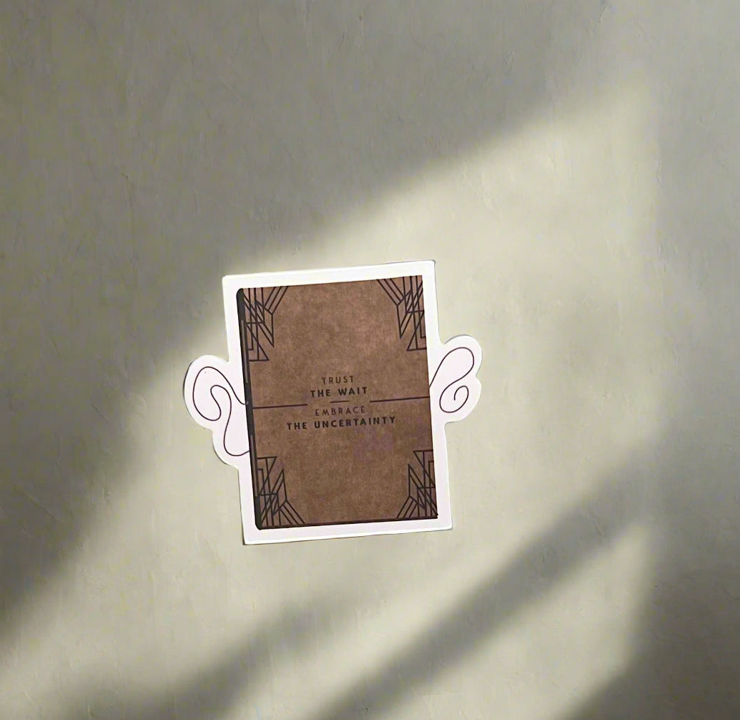 Embrace the journey with our beautifully designed "Trust the Wait. Embrace the Uncertainty." sticker. This thoughtful decal serves as a gentle reminder to find serenity in the unknown and have faith in the unfolding of life. The unique design features abstract, wing-like elements that frame the powerful message, adding an artistic touch to any surface you choose to adorn.