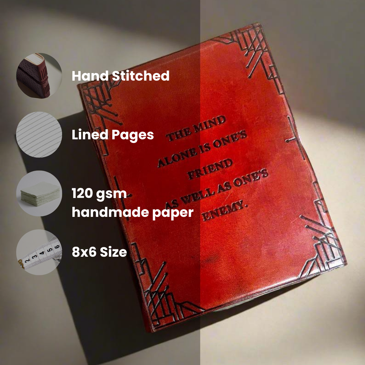 Delve into the complexities of thought with our inspiring "The Mind Alone" Leather Journal, embossed with the profound quote: “The Mind Alone is One’s Friend as Well as One’s Enemy.” This handcrafted red leather journal is designed to be a stylish and meaningful companion for writers, creatives, and deep thinkers, inviting daily reflection on the power of the human mind.